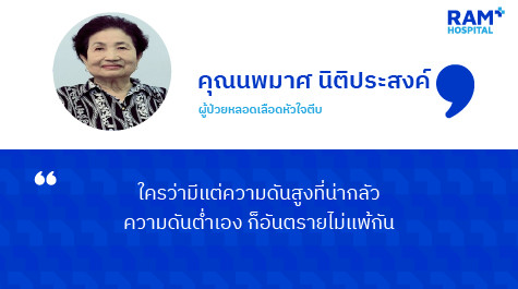 ด้วยการรักษาที่ทันท่วงที ภายใต้การดูแลของทีมแพทย์ผู้เชี่ยวชาญและเครื่องมือที่พร้อม จึงทำให้คุณนพมาศพักฟื้นที่โรงพยาบาลเพียง 3 วันเท่านั้น และหลังจากนั้นก็นัดมาตรวจอาการเป็นระยะๆ จนตอนนี้คุณนพมาศสามารถกลับมาใช้ชีวิตประจำวันเป็นปกติได้อีกครั้ง โดยอาการดังกล่าวเป็นอาการที่ค่อนข้างรุนแรง หากตัดสินใจผิดพลาดไปอาจส่งผลให้เกิดผลร้ายกับร่างกาย หรือสูญเสียได้ ฉะนั้นไม่ว่าจะมีอาการความดันสูงหรือความดันต่ำ ก็เป็นสิ่งที่ไม่ควรละเลยนะครับ ด้วยความปรารถนาดีจากหมอราม