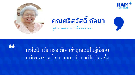 เมื่อต้องทำการรักษาอย่างจริงจัง คุณศรีสวัสดิ์และครอบครัวจึงเลือกย้ายมารักษาที่โรงพยาบาลรามคำแหง เพราะความเชี่ยวชาญของทีมแพทย์และเครื่องมือที่พร้อมมากกว่า หลังจากการตรวจวินิจฉัยกันอย่างละเอียดอีกครั้ง คุณหมอจึงแนะนำวิธีการรักษาให้ และคนไข้ก็ได้ตัดสินใจรักษาด้วยวิธีการจี้จุดกำเนิดไฟฟ้าผิดปกติในหัวใจ ผ่านการสวนหลอดเลือด