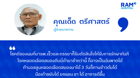 ตอนมาถึงโรงพยาบาล ซีกซ้ายนี้ไปหมดทั้งแขนขา หลังจากผ่าตัดแล้วก็รู้สึกว่าเคลื่อนไหวไม่ได้ ให้ยกแขนก็รู้สึกปวดที่หัวไหล่ ยกขาก็ยกไม่ได้ ปวดที่ต้นขา คุณหมอทำการเอกซเรย์สมองด้วย เครื่อง CT SCAN และแนะนำให้ทำการรักษาด้วยวิธีการขยายหลอดเลือดสมองตีบด้วยบอลลูนเป็นความโชคดีของผมที่มาโรงพยาบาลเร็วและภรรยาก็รีบตัดสินใจให้รับการรักษาทันที โรคหลอดเลือดสมองตีบนี่ถ้ามาช้ากว่านี้ ก็อาจเป็นอัมพาตได้ ทำบอลลูนหลอดเลือดสมองมาได้ 3 วันก็ทานข้าวต้มได้ มือเท้าขยับได้ ยกแขน ขา ได้ อาการดีขึ้น