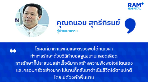 ตนเองป่วยด้วยโรคเบาหวานอยู่แล้ว บังเอิญก่อนมาพบแพทย์ได้รับประทานสมุนไพรชนิดหนึ่ง ซึ่งต่อมา ในช่วงกลางดึกคืนหนึ่งได้เกิดอาการร้อนไปทั่วตัว ใจสั่น แม้จะนั่งพักแต่ก็ยังไม่มีทีท่าว่าจะกลับมาเป็นปกติ ทำให้ตัดสินใจไปโรงพยาบาลรามคำแหง เนื่องจากอยู่ใกล้บ้านและตนมีความมั่นใจในการรักษาอยู่แล้ว แต่หลังจากได้เข้ารับการตรวจหัวใจด้วยวิธีต่างๆแล้ว กลับไม่พบความผิดปกติแพทย์จึงตัดสินใจตรวจด้วยการฉีดสีเอกซเรย์ ซึ่งผลที่ปรากฏออกมาได้สร้างความตกใจให้ตนเองอย่างมาก เนื่องจากพบว่ามีภาวะเส้นเลือดหัวใจตีบถึง 3 เส้น โดยเส้นแรกตีบไปเกือบ 40% ขณะที่เส้นที่ 2 ตีบไปแล้ว 80% ส่วนเส้นสุดท้ายตีบสนิท 100% เลยทีเดียว ตนเองนั้นโชคดีที่มาหาแพทย์และตรวจพบได้ทันเวลา จึงได้ตัดสินใจให้แพทย์ทำการรักษาด้วยวิธีทำบอลลูนขยายหลอดเลือด ซึ่งทราบดีว่าเป็นการรักษาที่มีความเสี่ยงน้อย ไม่ต้องผ่าตัดและฟื้นตัวได้เร็ว ซึ่งการรักษาก็ประสบผลสำเร็จดีมาก สร้างความพึงพอใจให้ตนเองและครอบครัวอย่างมากและไม่นานก็กลับมาดำเนินชีวิตได้ตามปกติ โดยไม่ต้องพักฟื้นนาน
