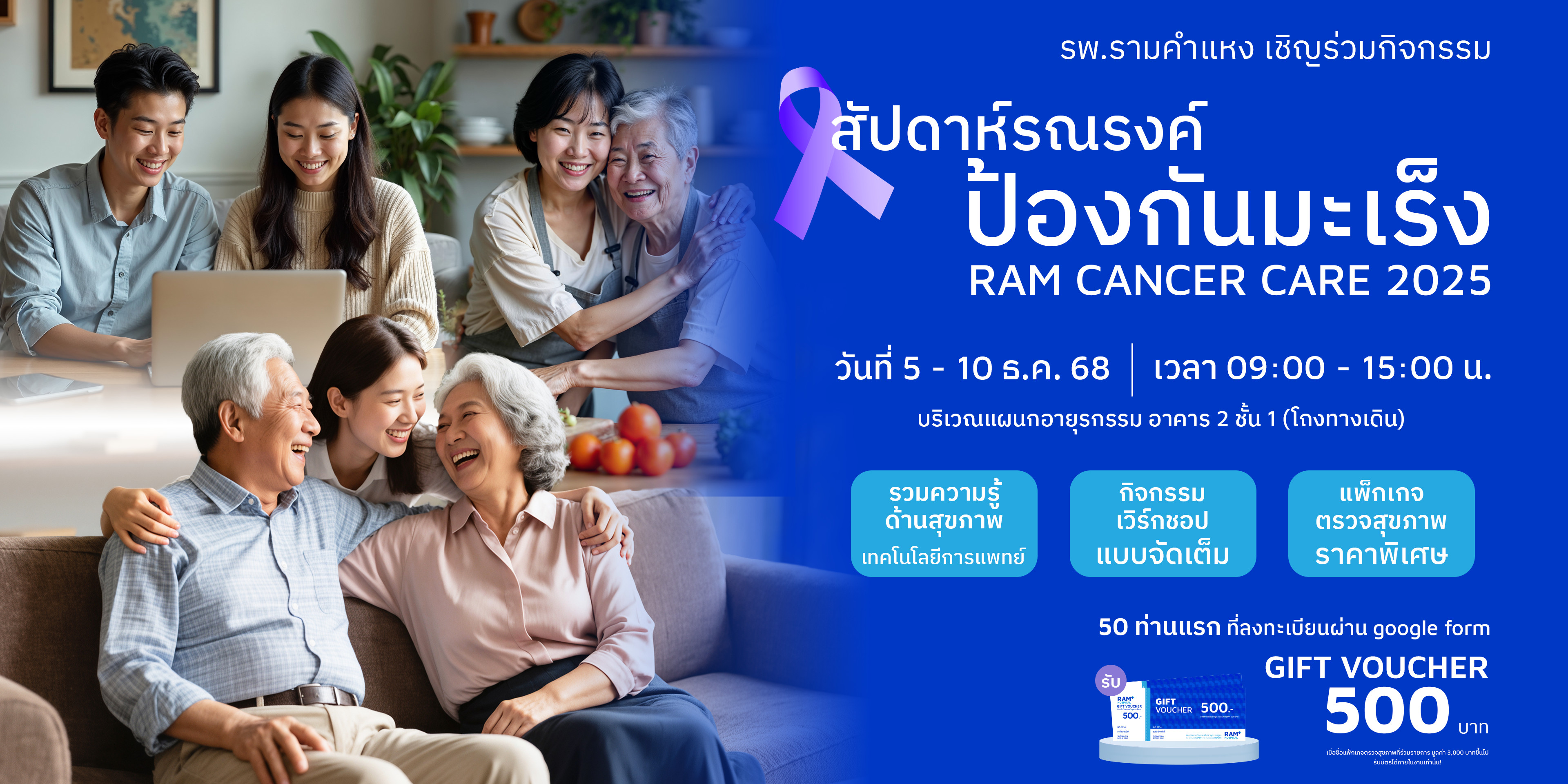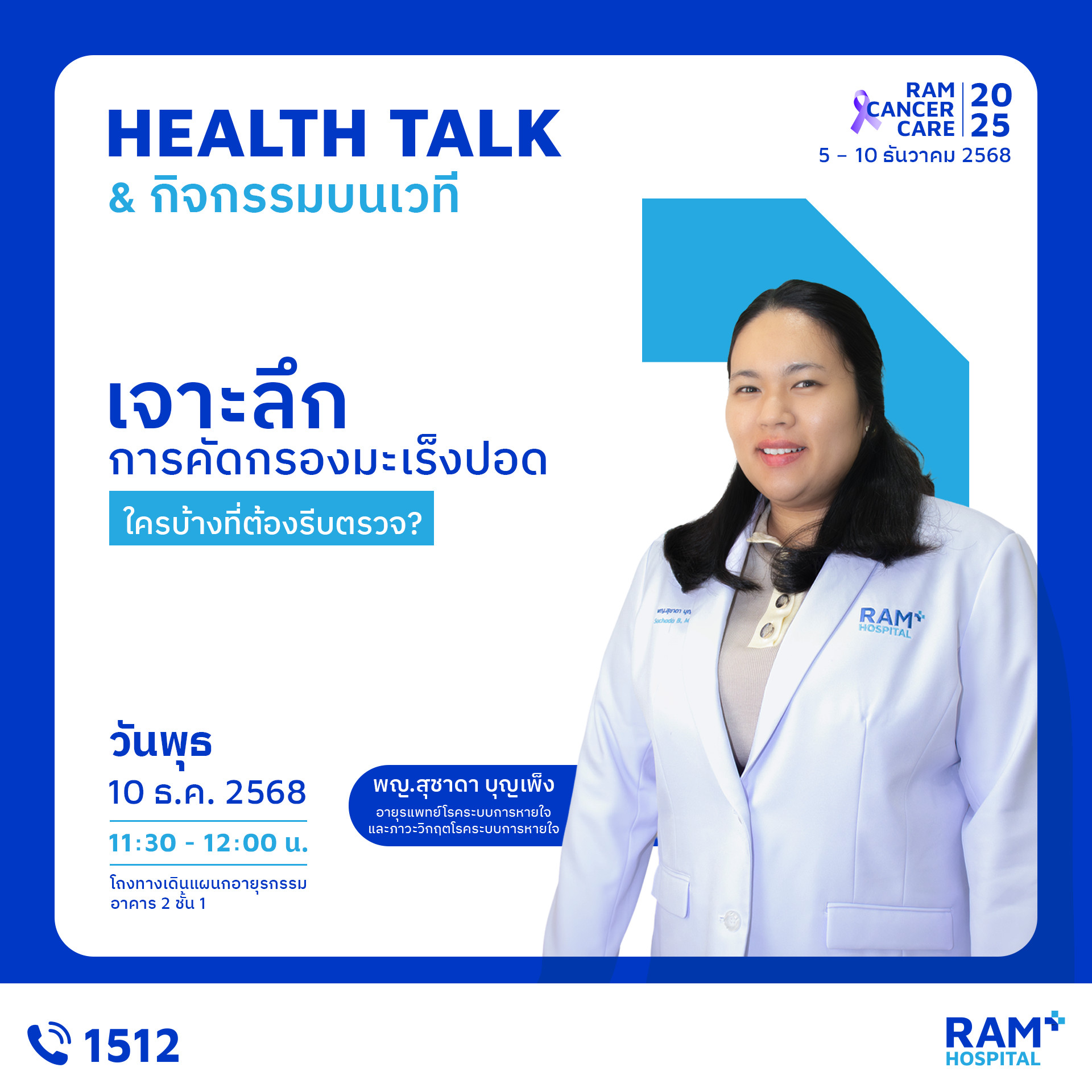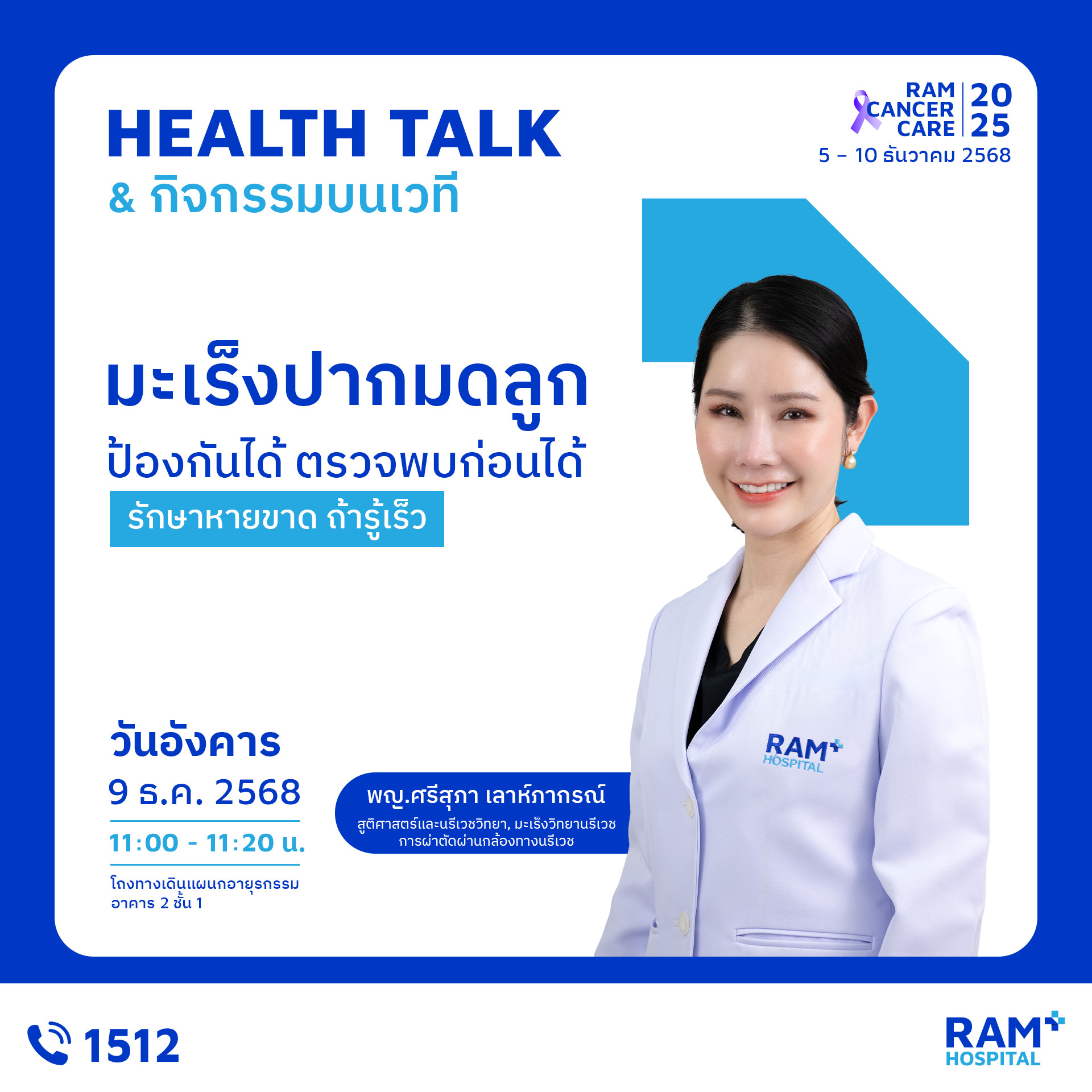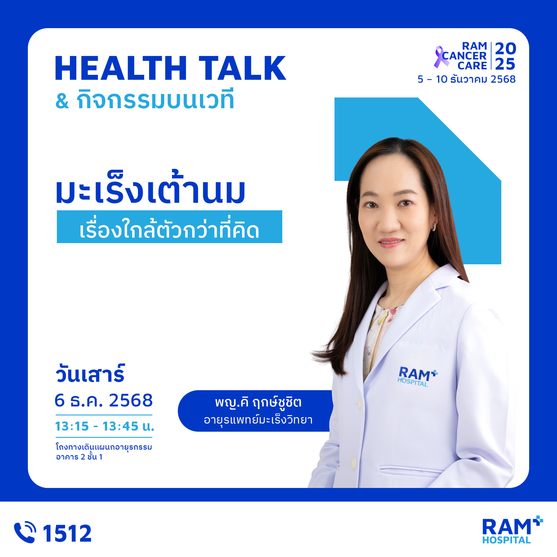 เพราะ “การรู้ก่อน” คือก้าวแรกของการป้องกันมะเร็ง งานนี้คืออีกหนึ่งกิจกรรมดี ๆ ที่โรงพยาบาลรามคำแหงตั้งใจจัดขึ้น เพื่อให้ประชาชนเข้าถึงความรู้ที่ถูกต้อง เข้าใจการป้องกัน และเห็นความสำคัญของการตรวจคัดกรองมะเร็ง มาร่วมเรียนรู้ ดูแลตัวเอง และส่งต่อกำลังใจไปพร้อมในงาน Ram Cancer Care 2025 แล้วพบกันในงานนะคะ