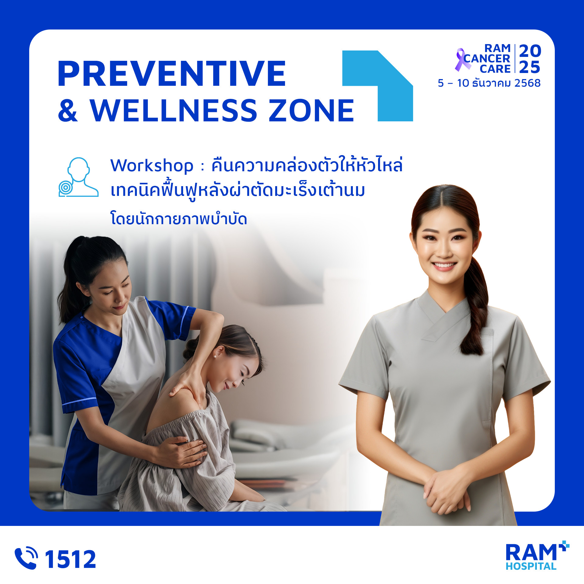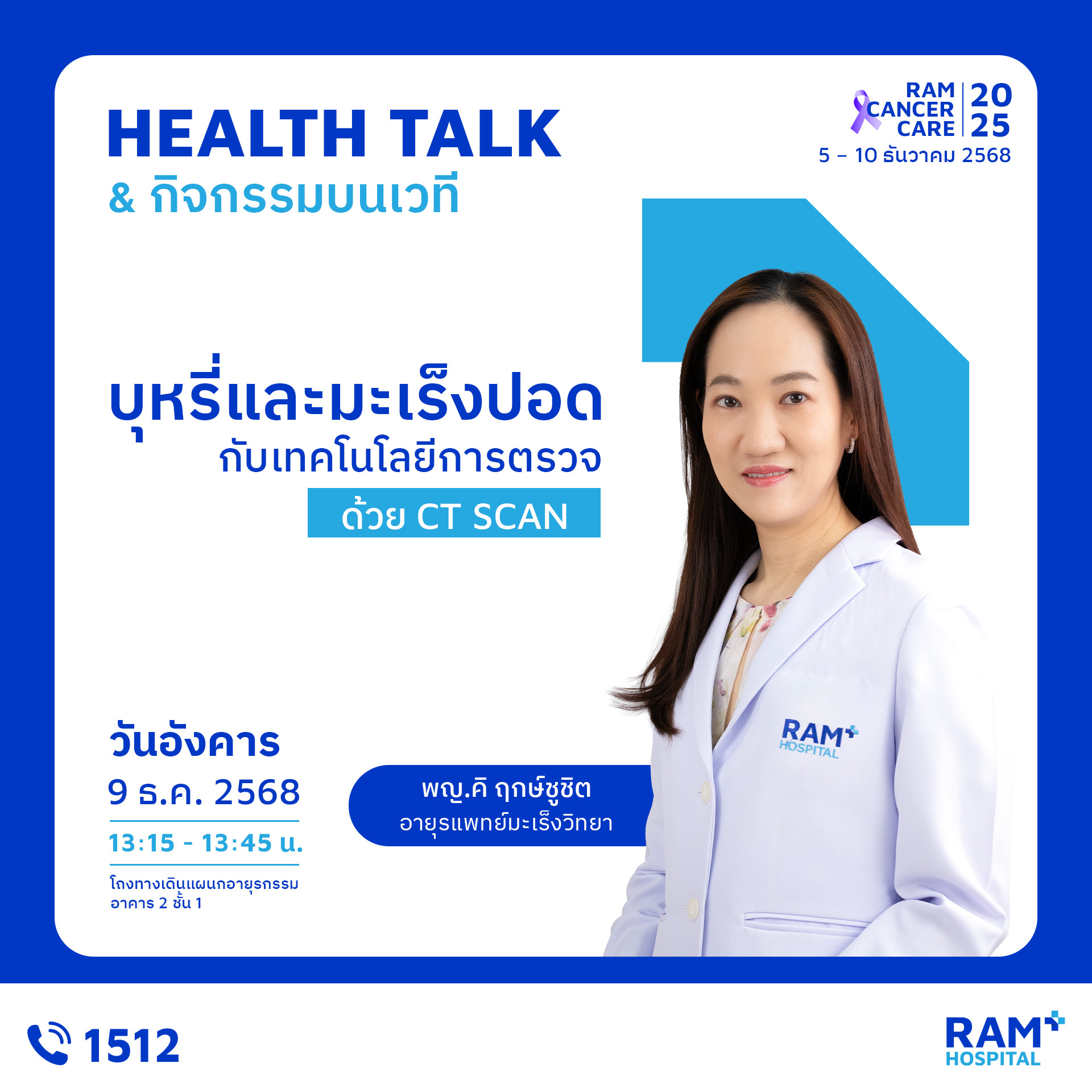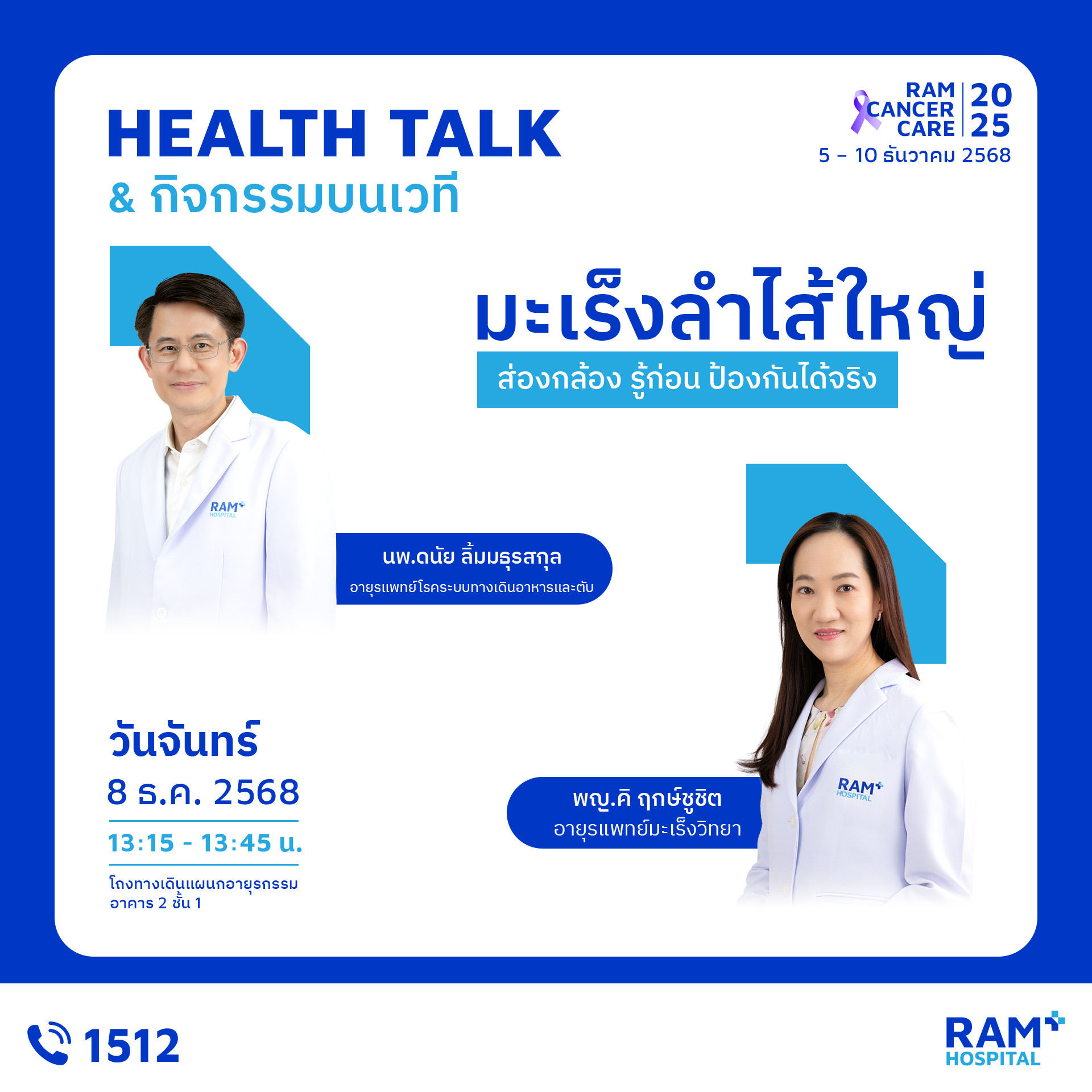 เพราะ “การรู้ก่อน” คือก้าวแรกของการป้องกันมะเร็ง งานนี้คืออีกหนึ่งกิจกรรมดี ๆ ที่โรงพยาบาลรามคำแหงตั้งใจจัดขึ้น เพื่อให้ประชาชนเข้าถึงความรู้ที่ถูกต้อง เข้าใจการป้องกัน และเห็นความสำคัญของการตรวจคัดกรองมะเร็ง มาร่วมเรียนรู้ ดูแลตัวเอง และส่งต่อกำลังใจไปพร้อมในงาน Ram Cancer Care 2025 แล้วพบกันในงานนะคะ