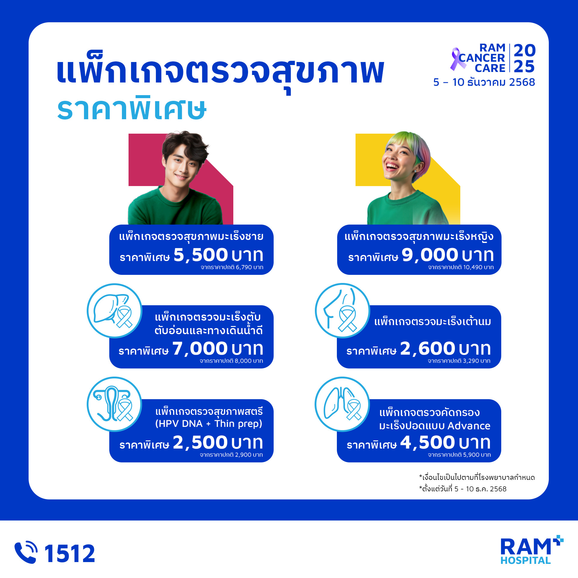 โรงพยาบาลรามคำแหง ขอเชิญผู้สนใจเข้าร่วมกิจกรรม “สัปดาห์รณรงค์ป้องกันมะเร็ง” ระหว่างวันที่ 5 – 10 ธันวาคม 2568 เวลา 09.00 – 15.00 น. บริเวณแผนกอายุรกรรม อาคาร 2 ชั้น 1 (โถงทางเดิน) โรงพยาบาลรามคำแหง