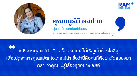 ไม่หยุดก็เลยไป รพ.ต่างจังหวัดแห่งหนึ่งเพราะมีประกันสังคมอยู่ที่นั่น...หมอเขาก็ตรวจแล้วก็ส่งตัวไป รพ.แห่งหนึ่งในกรุงเทพฯ เพื่อเอาก้อนเนื้อจากจมูกไปตรวจ พอผลตรวจออกมาว่าเป็นมะเร็ง และลามขึ้นสมองแล้วเขาไม่สามารถที่จะผ่าได้เขาก็เลยส่งมาที่ รพ.รามคำแหง เพราะทีมแพทย์พร้อม เครื่องมือพร้อมเห็นคุณหมอบอกเนื้องอกของคุณใหญ่มาก บอกว่า ใช้เวลาในการผ่าตัดนาน ถามว่ากลัวไหม