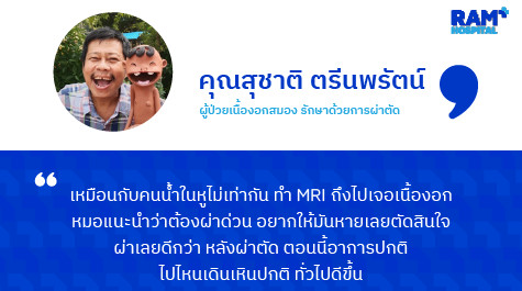 ผมก็เลยเรียก 1669 ขอไป รพ.รามคำแหง แอดมิดดีกว่า เราอยากเช็คให้แน่นอน ไปหาหมอภูริปัณย์แล้วเขาก็เช็คเรื่องประสาทตา ประสาทหู พอทำ MRI ถึงจะรู้ไงไปเจอเนื้องอก หมอก็แนะนำว่าต้องผ่าด่วน ผมก็เลยตัดสินใจผ่าเลยดีกว่า